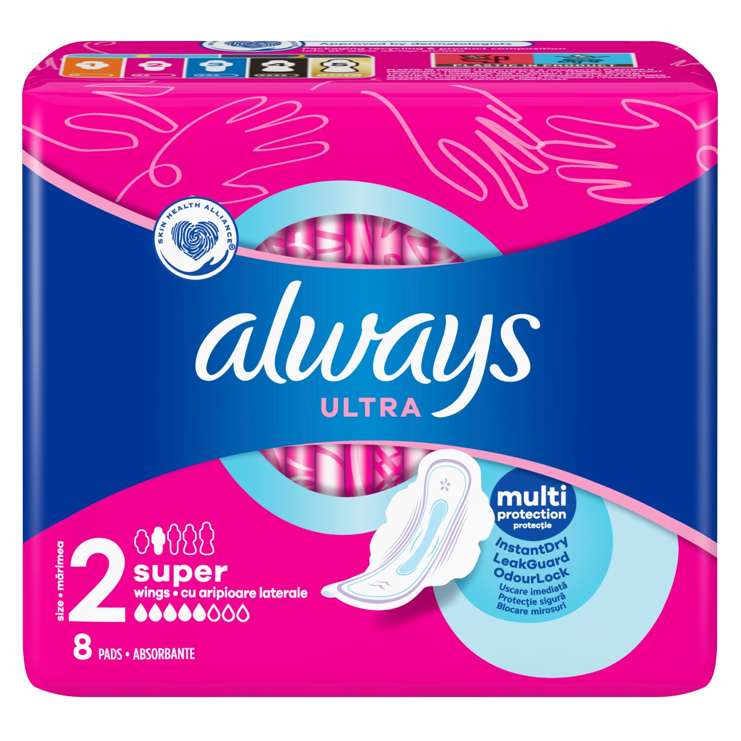 Az Always Ultra Super Plus egészségügyi betét a megbízható, hármas védelemre épül, így tökéletes választás a közepes vagy erősebb menstruációs napokra. Az InstantDry technológia másodpercek alatt felszívja a nedvességet, a LeakGuard rendszer segít megelőzni a szivárgást, az OdourLock technológia pedig semlegesíti a kellemetlen szagokat. A szárnyas kialakítás stabil illeszkedést, a puha fedőréteg pedig kényelmes viseletet biztosít a nap minden percében.