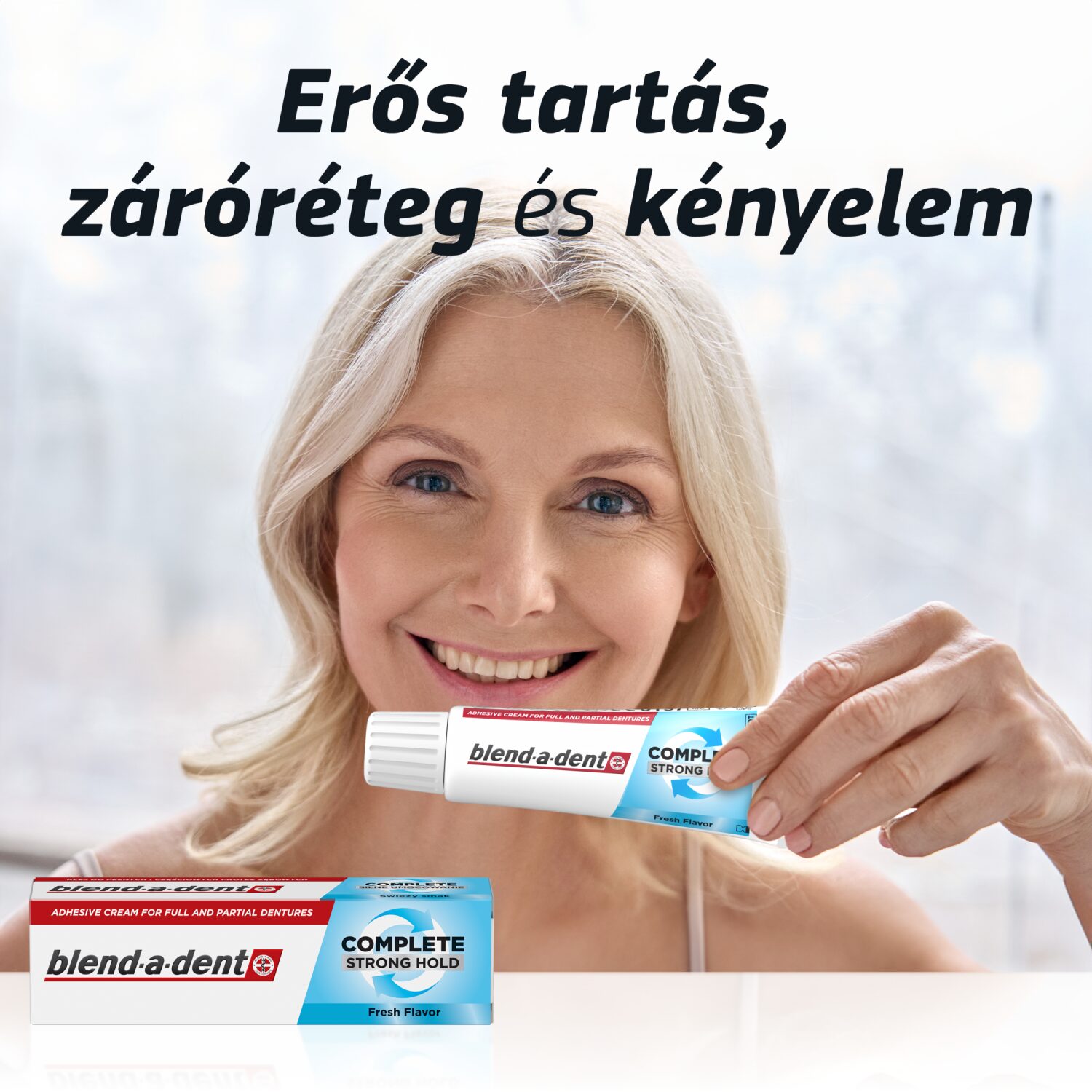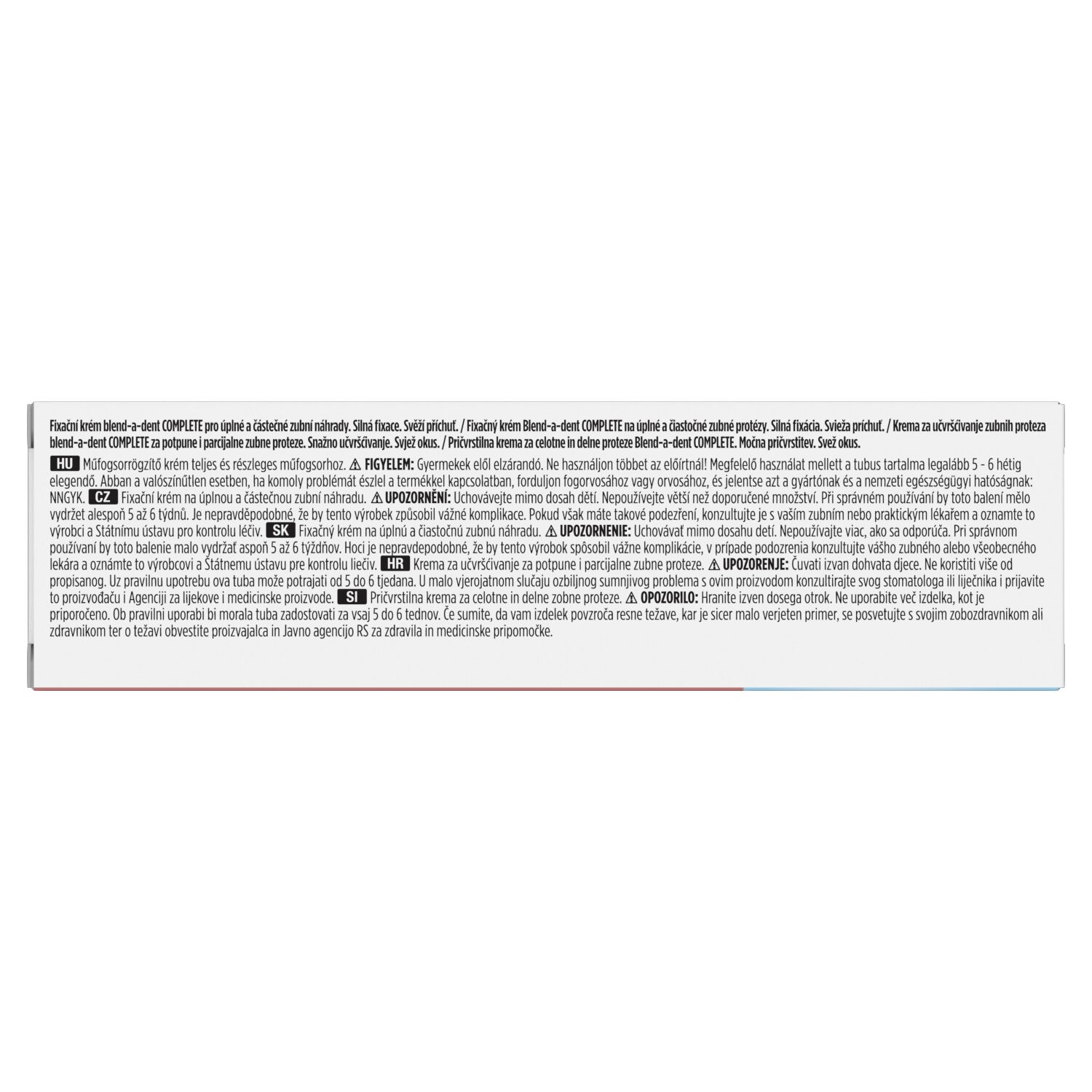 A Blend-a-dent Complete műfogsorrögzítő krém tökéletes választás azok számára, akik szívesen feledkeznek meg arról, hogy műfogsort viselnek. Bármit is csinál és bármilyen ételt is fogyaszt, magabiztossággal teheti azt a stabil és kényelmes műfogsorrögzítésnek köszönhetően. A Blend-a-dent Complete egész napon át erős rögzítést biztosít, a fogíny és a műfogsor közötti rést kitöltő rétegnek köszönhetően pedig kényelmes műfogsorviseletet kínál, illetve megakadályozza az ételdarabkák behatolását a műfogsor alá. Feledkezzen meg műfogsoráról és élvezze az élet minden egyes pillanatát! Próbálja ki az enyhén mentolos ízű változatot is!
