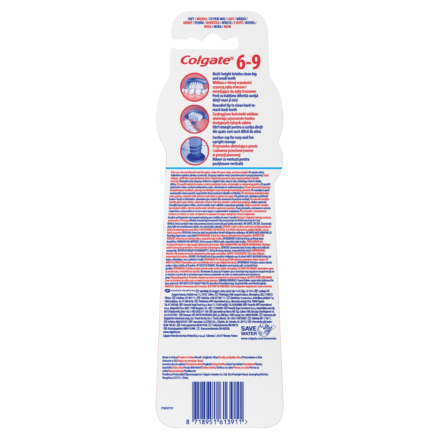 A Colgate Kids 6-9 éves gyermek fogkefe, többszintű, lágy sörtéivel tisztítja a nagyobb és kisebb fogacskákat és lekerekített sörtéivel segít könnyen elérni a hátsó fogakat is. A fogkefe nyelén egy tapadókorong található, aminek köszönhetően a fogkefe függőlegesen is tárolható.