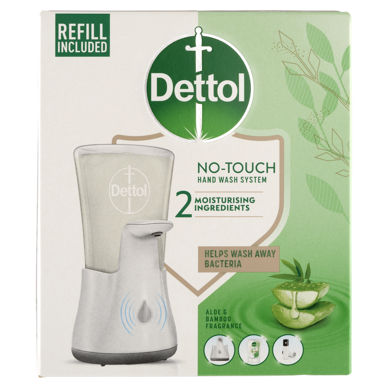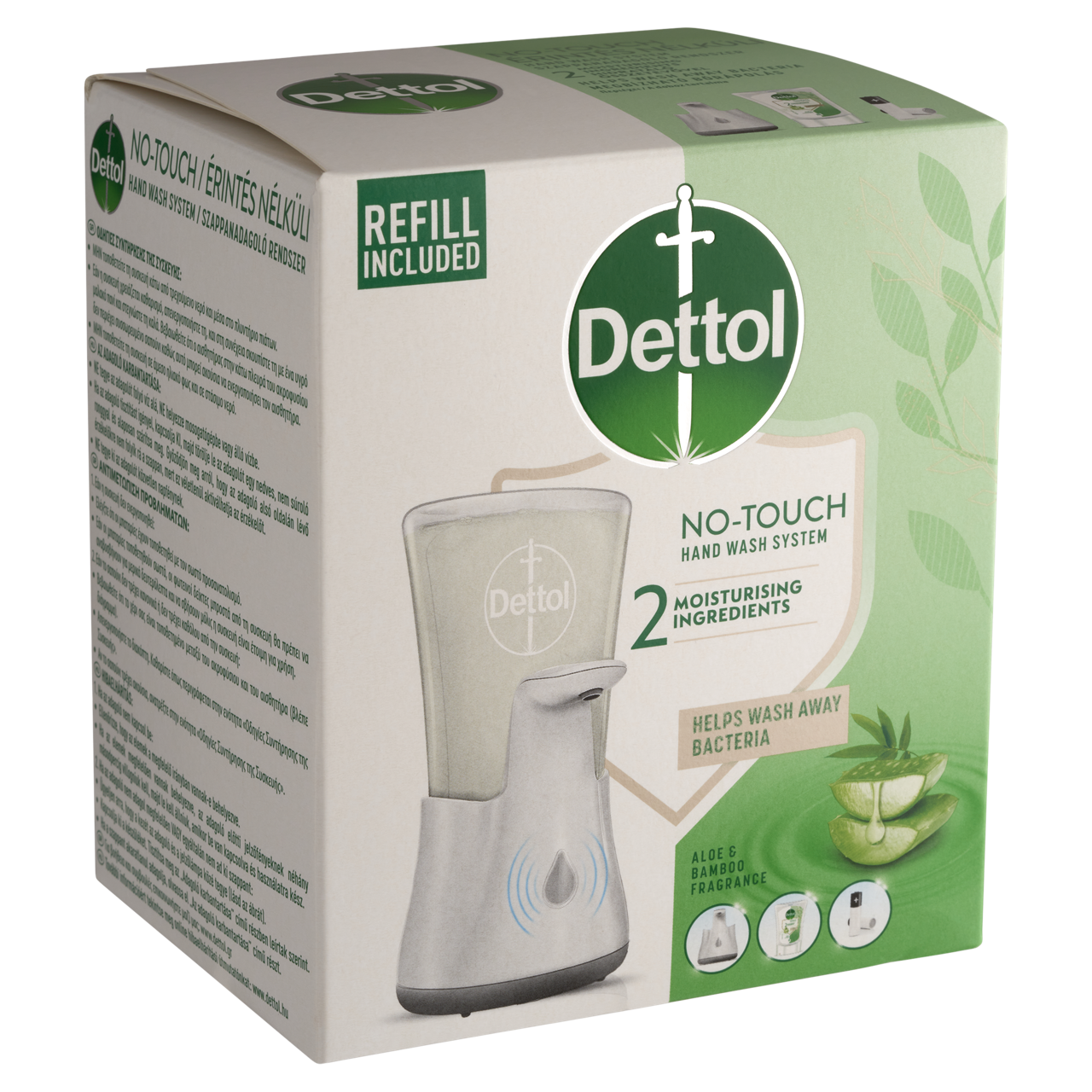 Dettol érintés nélküli kézmosó készülék, elemmel és Aloe Vera és E-vitamin-os utántöltővel, 250 ml-es kiszerelésben.