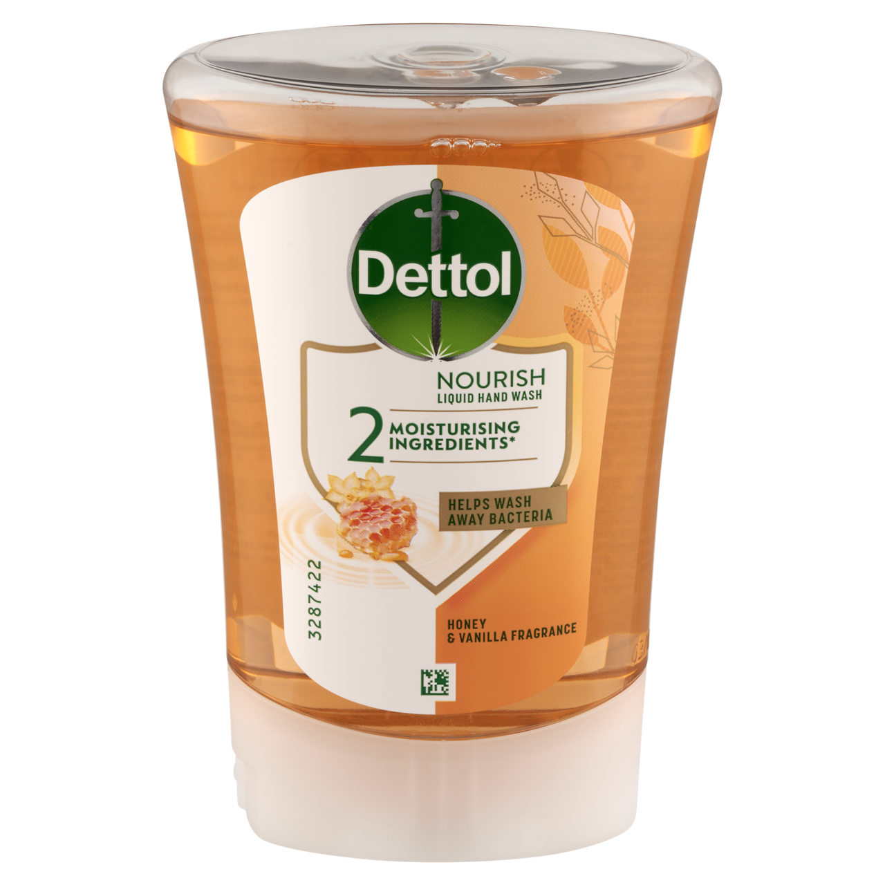 A Dettol érintés nélküli kézmosó készülék – Mézes utántöltő folyékony szappan formulája 2 hidratáló összetevővel* segít megőrizni a bőr természetes pH-értékét kézmosás után.