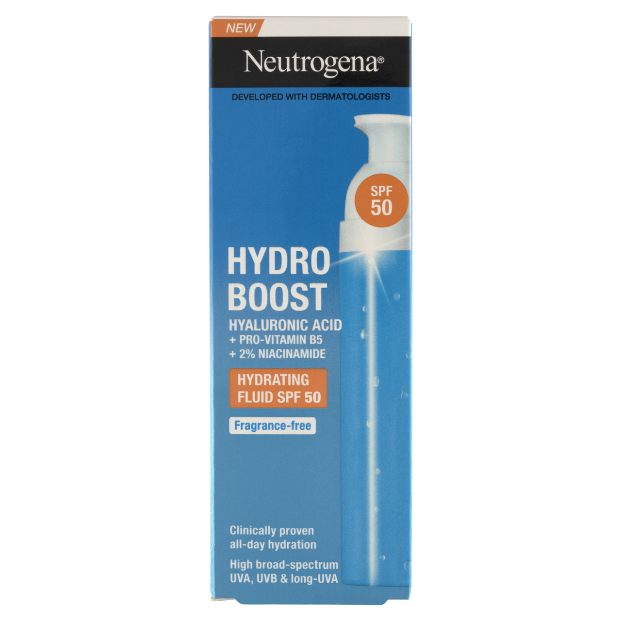 A Neutrogena Hydro Boost fluid SPF 50 egyedi, dermatológiailag tesztelt formulája négy hatóanyaggal támogatja a bőr hidratáltságát és egészségét: a hialuronsav segít megkötni a vizet és fokozza a hidratálást, a provitamin B5 (panthenol) fenntartja a bőr hidratációs barrierjét, a 2% niacinamide erősíti a ragyogást és javítja a bőr textúráját, az antioxidáns C- és E-vitamin pedig védelmet nyújt az UV-sugarak által okozott oxidatív stresszel szemben.