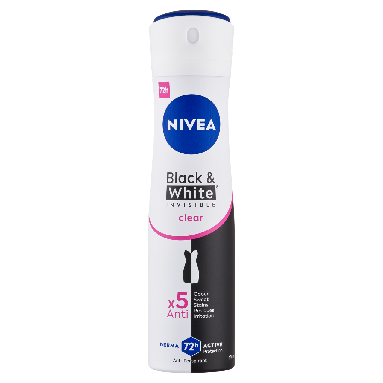 Bőrgyógyászok által igazolt bőrbarát formulája csökkenti a fehér foltok kialakulását a fekete ruhákon, valamint a sárga foltok kialakulását a fehér ruhákon. A termék golyós dezodor és stift kiszerelésben is elérhető: NIVEA Black & White Invisible Clear Izzadásgátló Deo Spray 150 ml.