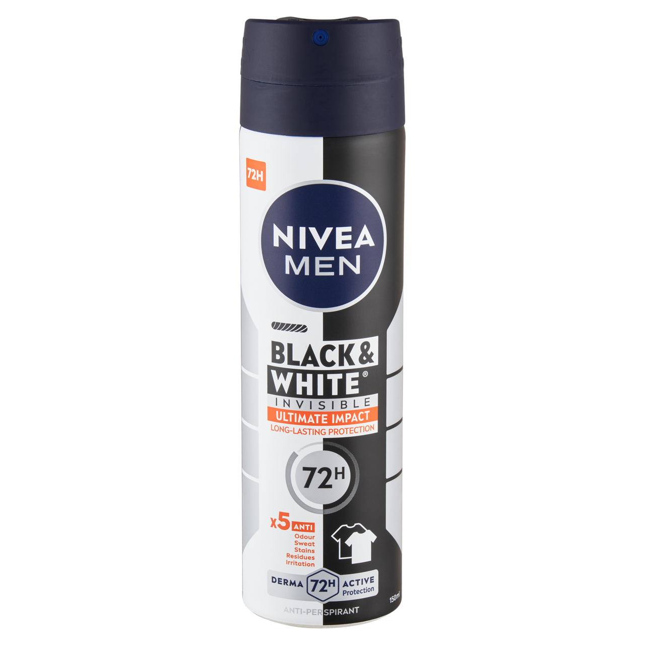 Ellenállhatatlan, frissítő, férfias illatot biztosít, miközben maximálisan véd az izzadság, foltok, testszag, deo-maradvány és irritáció ellen: NIVEA MEN Black & White Invisible Ultimate Impact Izzadásgátló Deo Spray 150 ml.