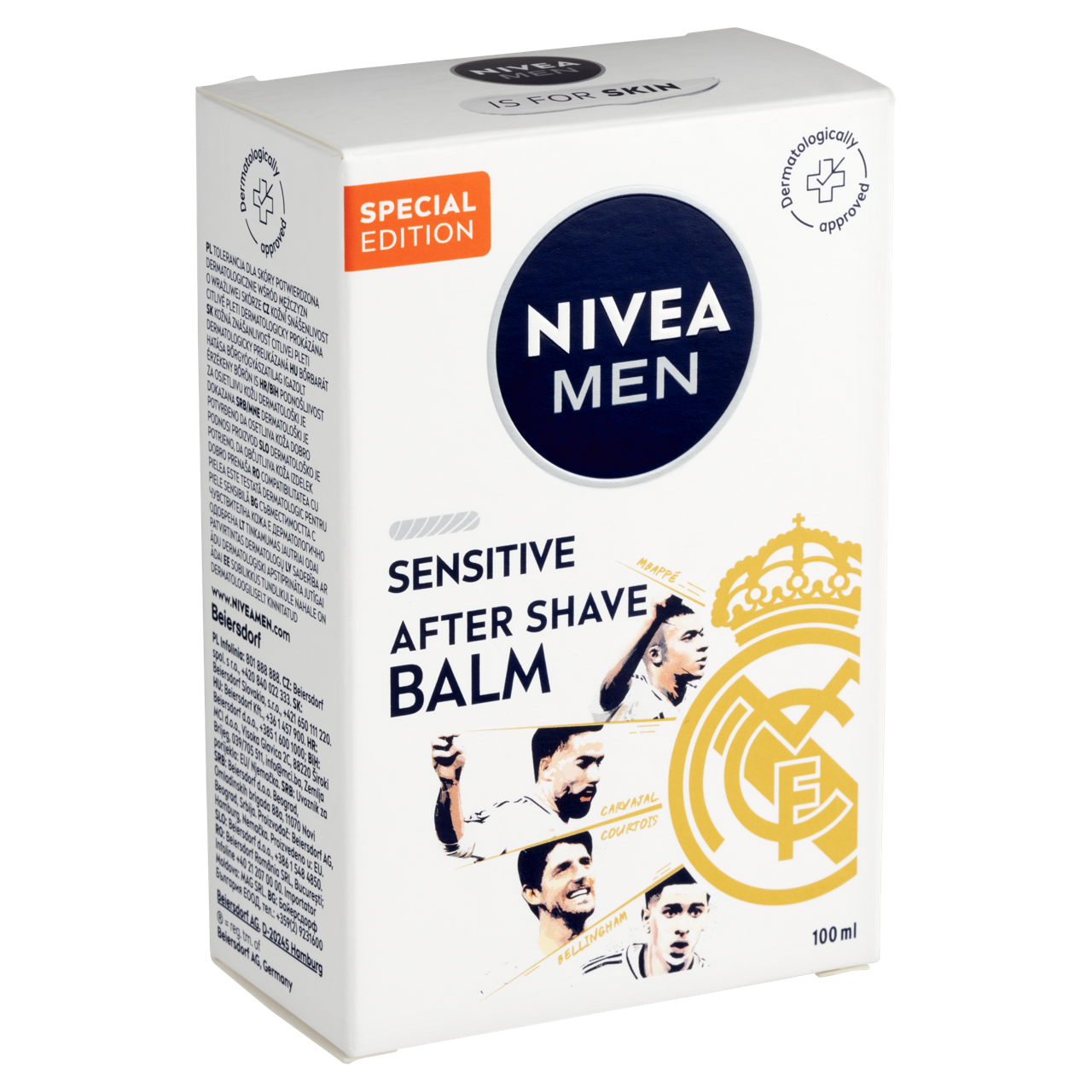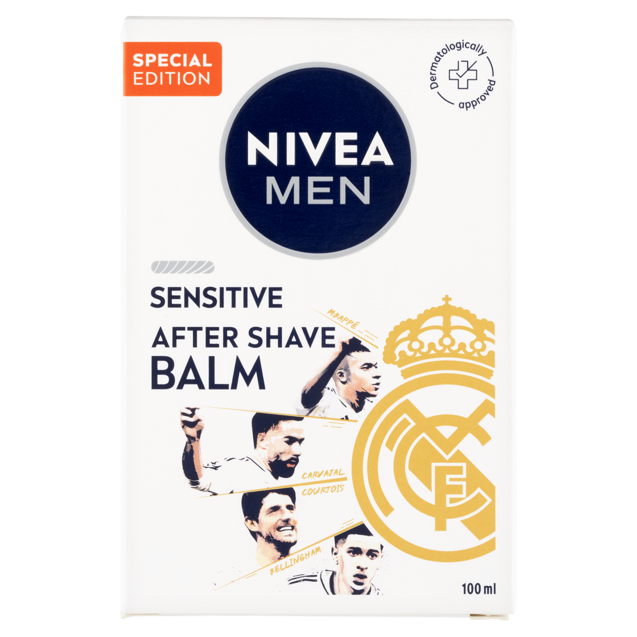A NIVEA MEN Sensitive after shave balzsam Real Madrid Special Edition különlegesen gyengéd, etil-alkohol mentes formula kamillával és E-vitaminnal, amelyet kifejezetten érzékeny bőrre fejlesztettek. Védelmet nyújt a borotválkozás során kialakuló bőrirritáció 5 tünete ellen, miközben 24 órás hidratálást biztosít. Ez a limitált Real Madrid kiadású, egyedi csomagolású változat ugyanazt a megbízható formulát tartalmazza, amelyet a férfiak milliói használnak nap mint nap.