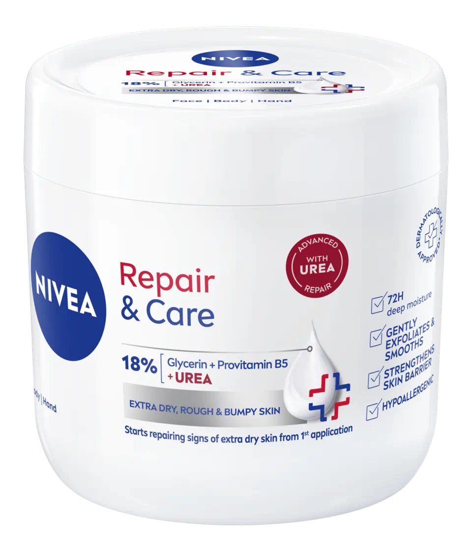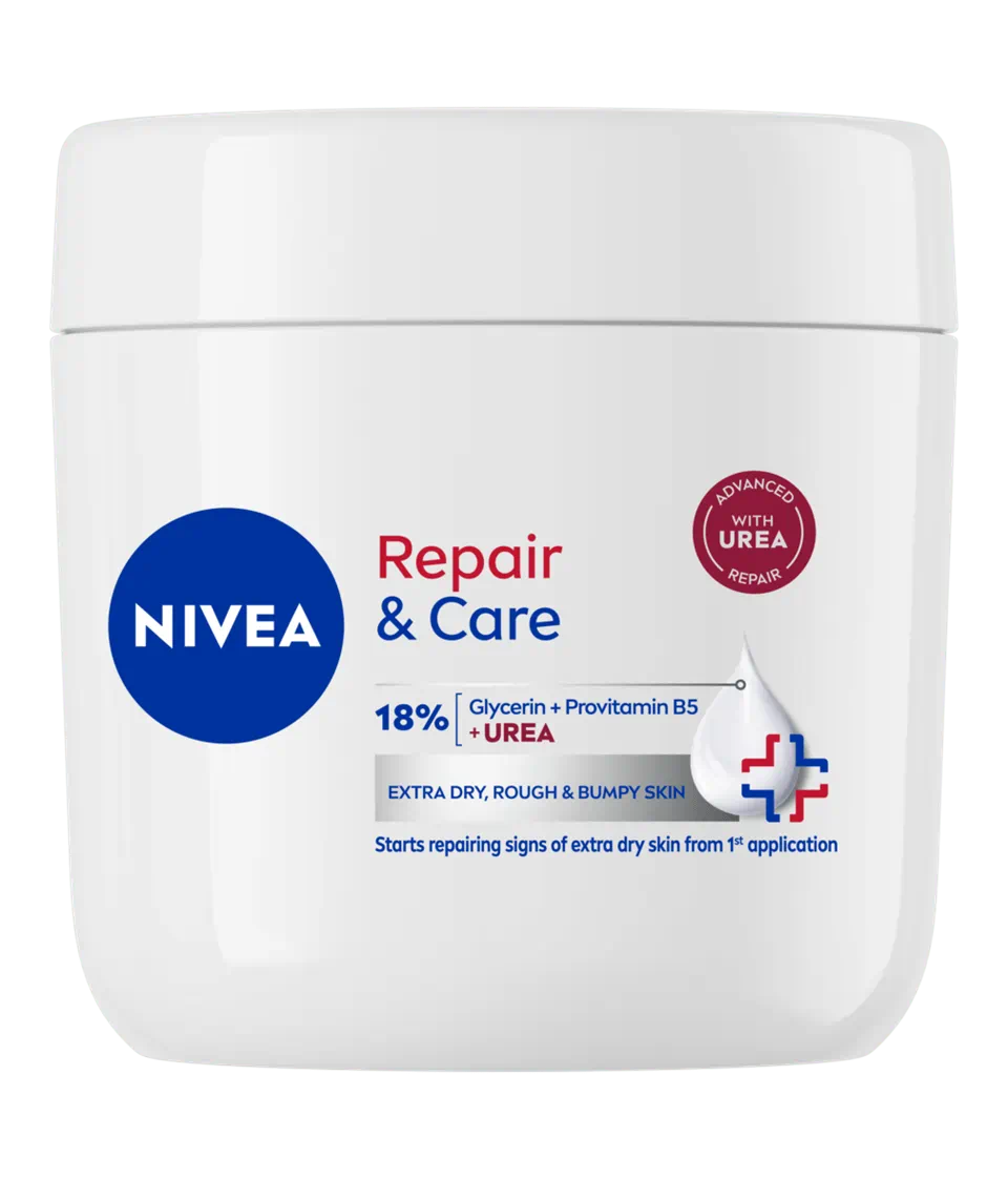 Már az első használattól segít helyreállítani az extra száraz bőrt, mélyrehatóan táplálja a bőrt és javítja a bőrszárazság láható jeleit, akár az első használattól kezdve: NIVEA Repair & Care Urea