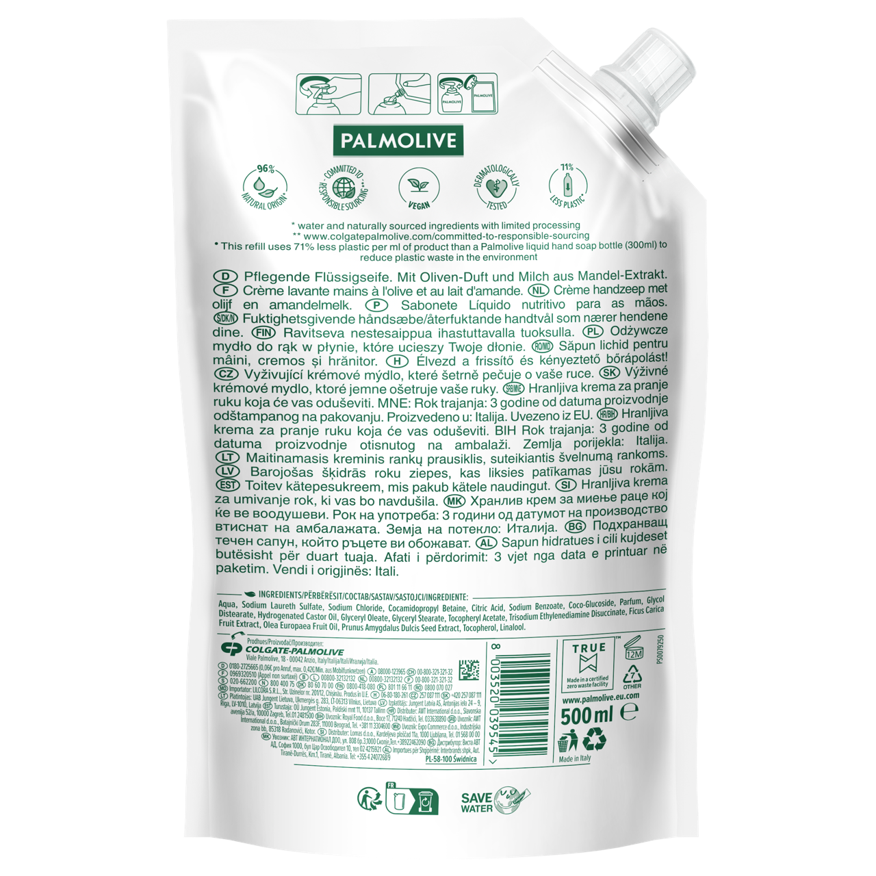 Palmolive Milk & Olive folyékony szappan utántöltő – tej proteint és olíva kivonatot tartalmaz. Bőrgyógyászatilag tesztelt.