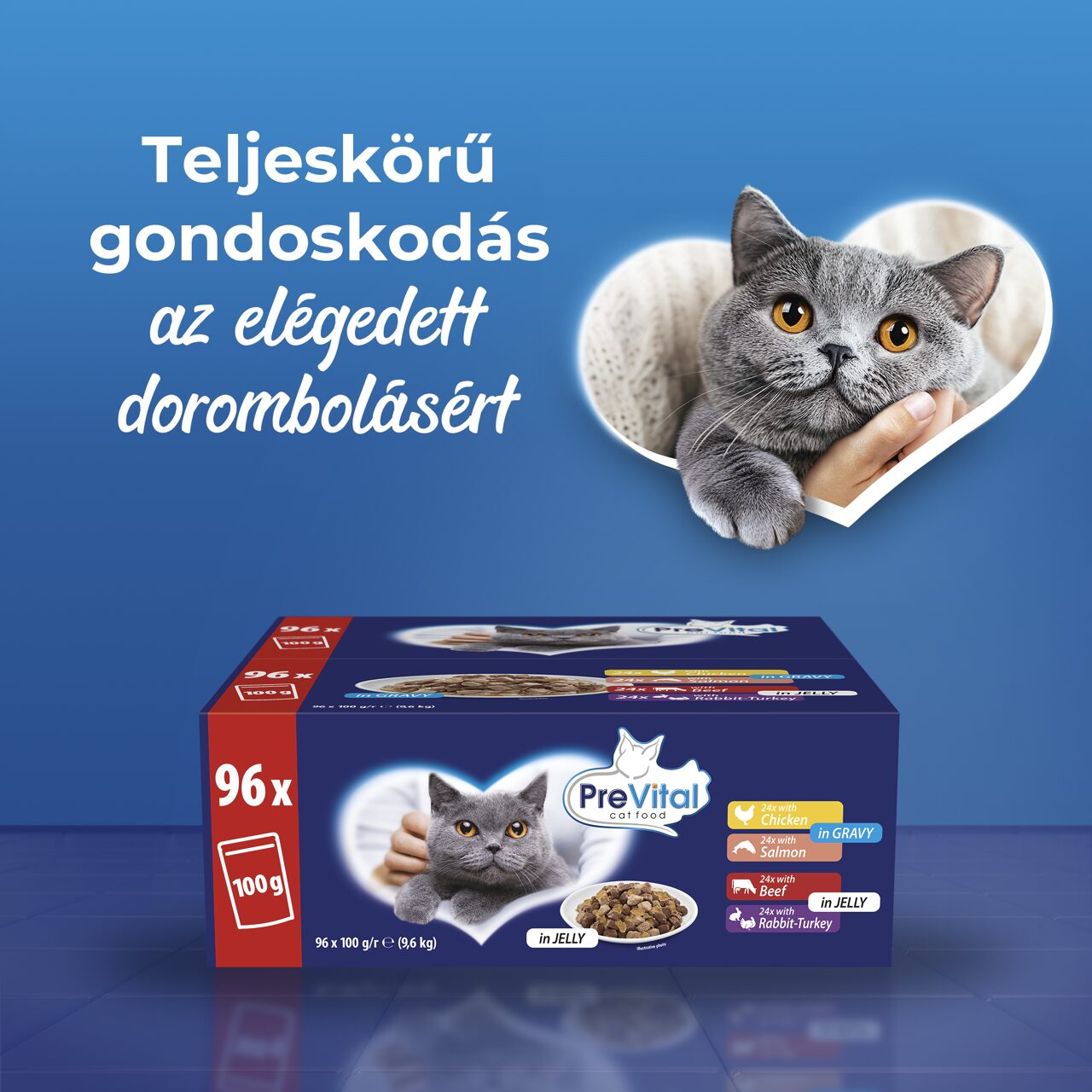 A PreVital alutasakos macskaeledel Giga Box a cicagazdik egyik legnagyobb kedvence: egyetlen dobozban 96 tasak, négy különböző ízben – csirkével, borjúval, lazaccal és ivartalanított macskáknak szánt májas változattal szószban. A nagy kiszerelés nemcsak kényelmes, de gazdaságos is: ritkábban kell utánvásárolni, és cicád minden nap más-más ízű, friss, tápláló eledelhez jut. A PreVital termékcsaládot úgy fejlesztették ki, hogy a kölyökcicától az idősebbig minden életkorban 100%-ban teljes értékű és kiegyensúlyozott táplálékhoz juthasson kedvenced.