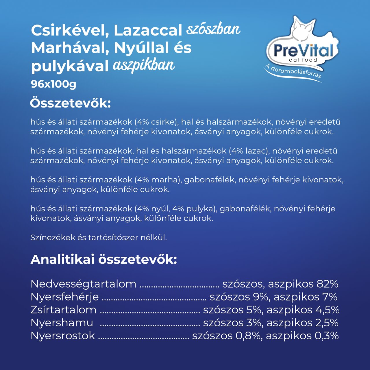Csirke, borjú, lazac változatok: Nedvességtartalom 82%, Nyersfehérje 9%, Zsírtartalom 5%, Nyershamu 3%, Nyersrostok 0,8%