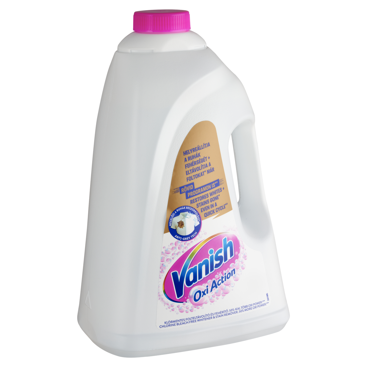 A fehér ruhákhoz készült Vanish folyékony fehérítő és folteltávolító nemcsak hogy az első mosáskor eltávolítja a foltokat, hanem akár 10 árnyalattal fehérebb ruhákat eredményez. Egyedülálló összetételének köszönhetően mélyen behatol a szövetbe, ugyanakkor maximálisan kíméletes a textíliákhoz. Fehérítő összetevőket tartalmaz, hogy ragyogó fehérséget biztosítson a ruhaneműnek, és eltávolítja az összes friss és beszáradt foltot. VANISH Oxi Action nagyszerű segítő a fehér textíliák tökéletes megjelenéséhez.